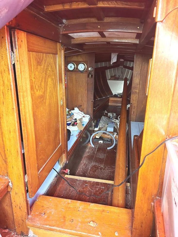 Hull was completely stripped out, her interior furniture and fittings all restored or rebuilt , re varnished. The exterior hull planking was burnt off and re caulked.