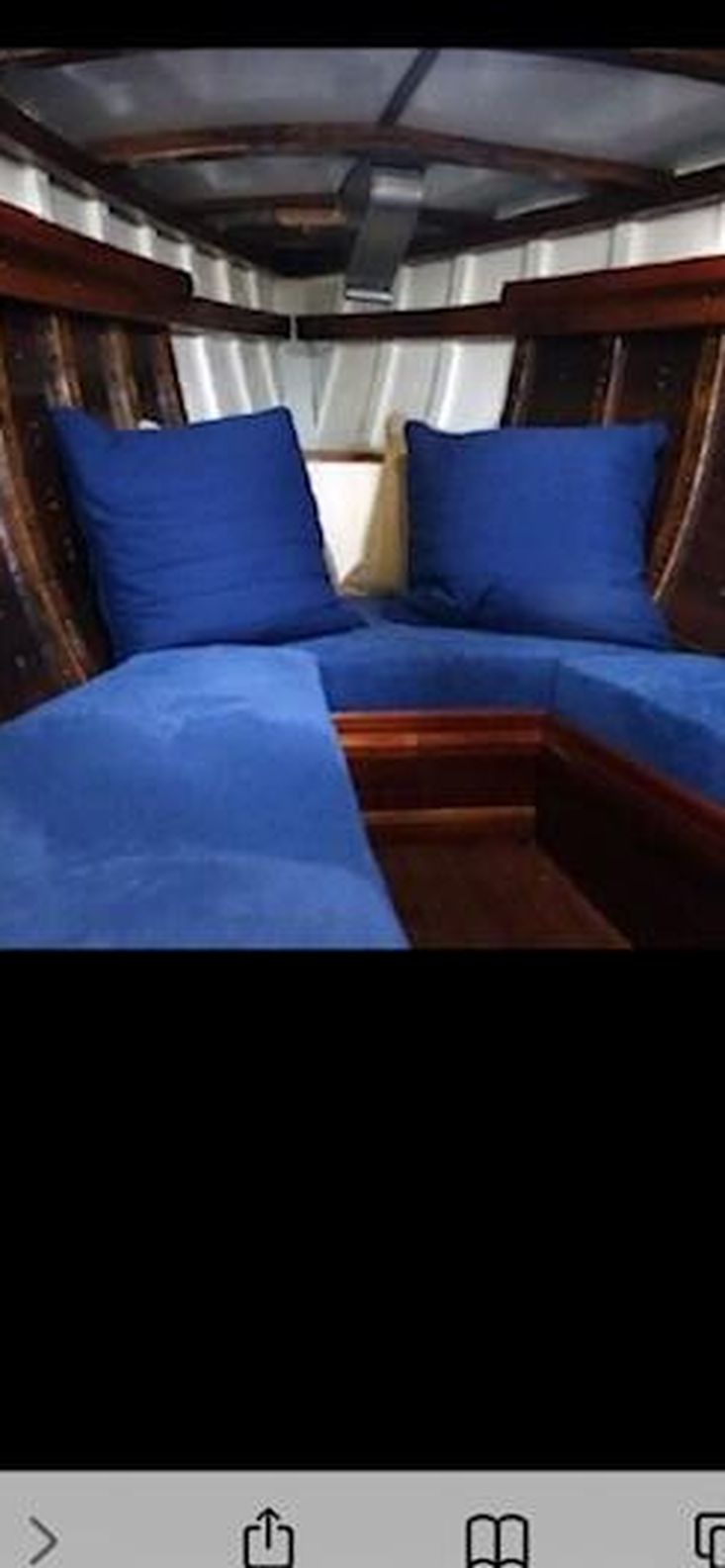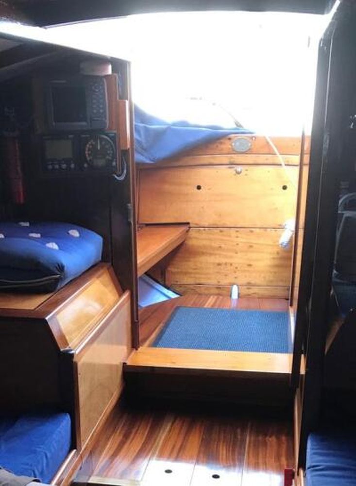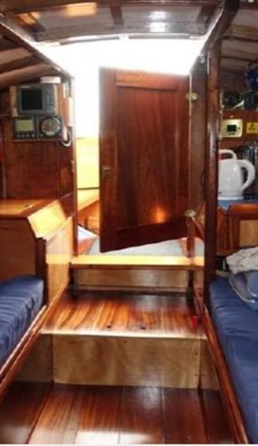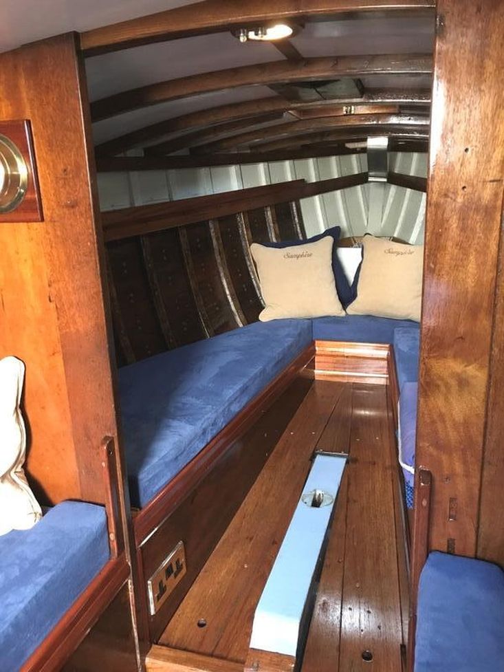 In the fore cabin a new Jabsco sea toilet, hidden away under the starboard side berth in the forepeak . A privacy door between the cabin areas. 4 x single settee berths all of a generous length. All new berth cushioning, in blue high quality velveteen upholstery. Hatch in the foredeck.